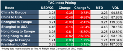 The TAC index this morning shows air freight rates out of China, to both Europe and the US, sank nearly 10% in the week ending yesterday. But the biggest drops were out of Hong Kong, where prices fell 16% to the US, to $4.29, and 15% to Europe ($3.25).