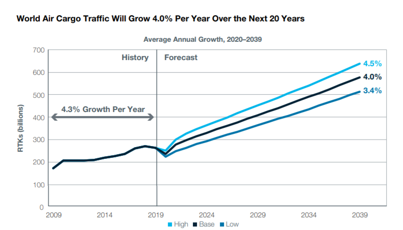 Boeing projects air cargo traffic will double by 2039 with annual growth of 4.1%, including express shipments.