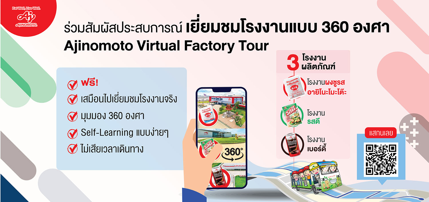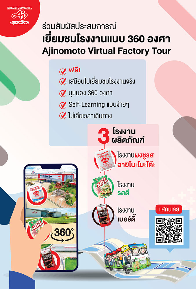 Ajinomoto 360 Virtual Factory Tour is ready to welcome everyone to join via https://onlineajinomotofactorytour.com/ or scan QR code in the poster. In addition, if the COVID-19 situation is getting better, you can actually visit the real factory through https://www.ajinomoto.co.th/th/our-activity/general-factory-visit.