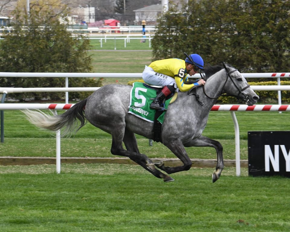 Main Photo: Giggle Factory winning a 1 1/16th mile Allowance at Aqueduct April 9, 2022. (NYRA/Coglianese)