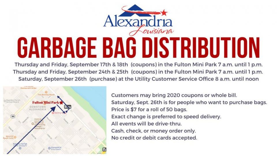 ‘ALEXANDRIA, La. – The City of Alexandria will be providing free garbage bags to utility customers with coupons from this year for bags from 7 a.m. until 1 p.m. this Thursday and Friday, Sept. 17-18, as well as Sept. 24-25 at the Alexander Fulton Mini Park in downtown Alexandria, across from City Hall.