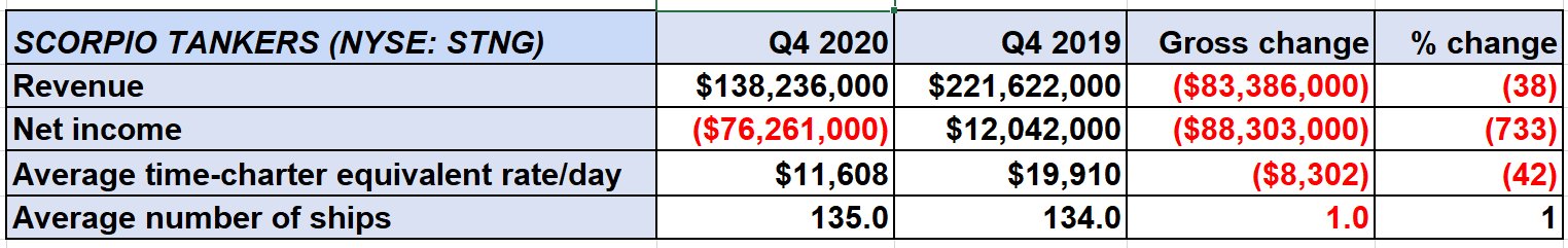 On Thursday, Scorpio Tankers reported a net loss of $76.3 million for Q4 2020 compared to net income of $12 million in the same period the prior year. The adjusted loss per share of $1.04 came in a sliver better than consensus expectations for a loss of $1.05.