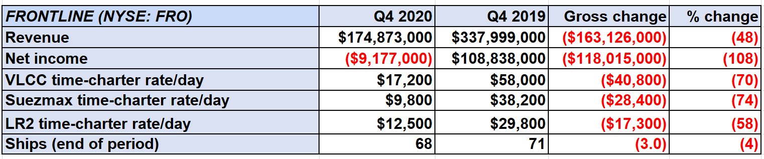 On Friday, Frontline reported a net loss of $9.2 million for Q4 2020 compared to net income of $108.8 million in Q4 2019. The adjusted loss per share of 7 cents came in below consensus expectations for a loss of 5 cents.