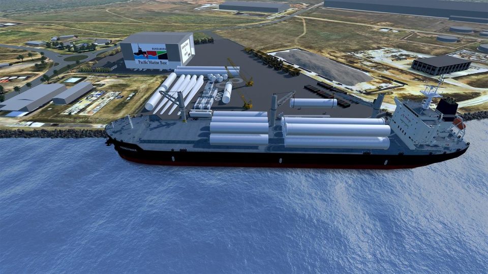 Pictured above is one possible scenario for Pacific Marine Base Bundaberg, which could see the facility support sea freight transport, project cargoes and connection of the greater Wide Bay area to the “Blue Highway”.