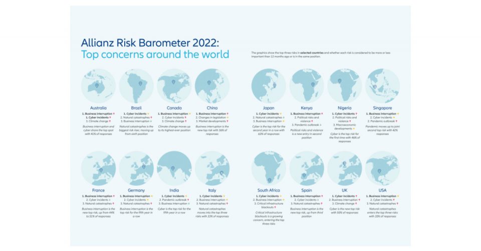 Cyber incidents tops the Allianz Risk Barometer for only the second time in the survey’s history (44% of responses), Business interruption drops to a close second (42%) and Natural catastrophes ranks third (25%), up from sixth in 2021. Climate change climbs to its highest-ever ranking of sixth (17%, up from ninth), while Pandemic outbreak drops to fourth (22%). The annual survey from Allianz Global Corporate & Specialty (AGCS) incorporates the views of 2,650 experts in 89 countries and territories, including CEOs, risk managers, brokers and insurance experts. View the full global and country risk rankings.