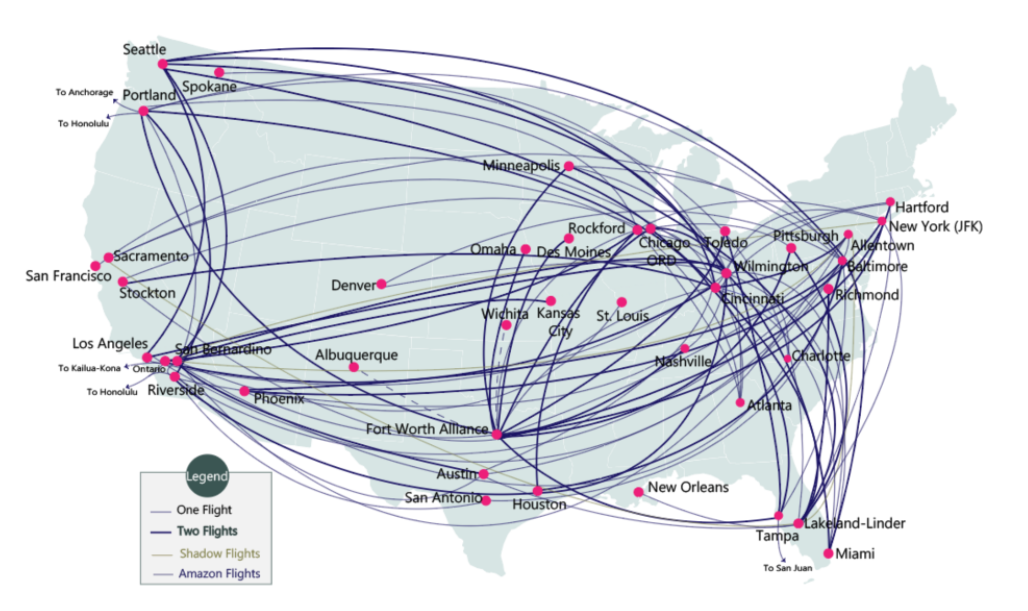Amazon’s air network could allow a shipper that tenders a load at 7 p.m. in Cincinnati to have the packages delivered by the next afternoon, or early evening, to points in all of the 25 largest U.S. metropolitan areas, with next day delivery covering 90% of the U.S. population, the analysis indicated.