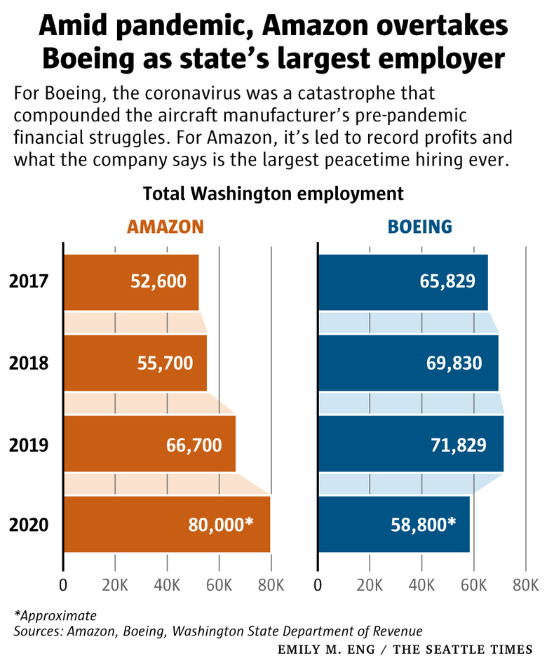 The company employs so much seasonal labor that taking into account all of Amazon’s short-term hires — brought onboard for a few months during the holidays — Amazon actually surpassed Boeing as the state’s largest employer in 2019. That year, 81,897 Washingtonians worked for Amazon.