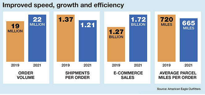That thinking was also applied to e-fulfillment. The results: Between 2019 and 2021, AEO grew its e-commerce business from $1.27 billion to $1.72 billion and its annual order volume from 19 million orders to 22 million.
