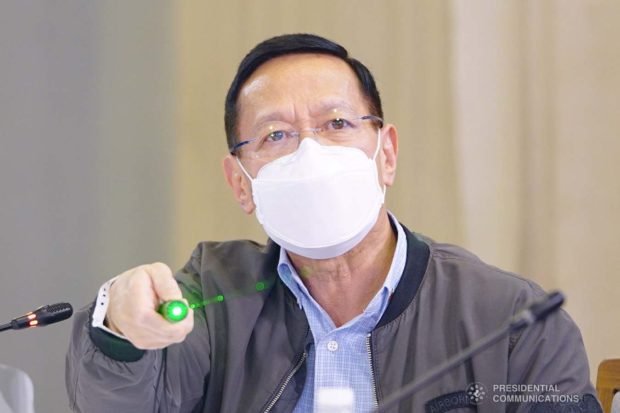 (FILE) Health Secretary Francisco Duque III gives an update to President Rodrigo Roa Duterte during a meeting with the Inter-Agency Task Force on the Emerging Infectious Diseases (IATF-EID) core members at the Arcadia Active Lifestyle Center in Matina, Davao City on August 30, 2021. JOEY DALUMPINES/ PRESIDENTIAL PHOTO