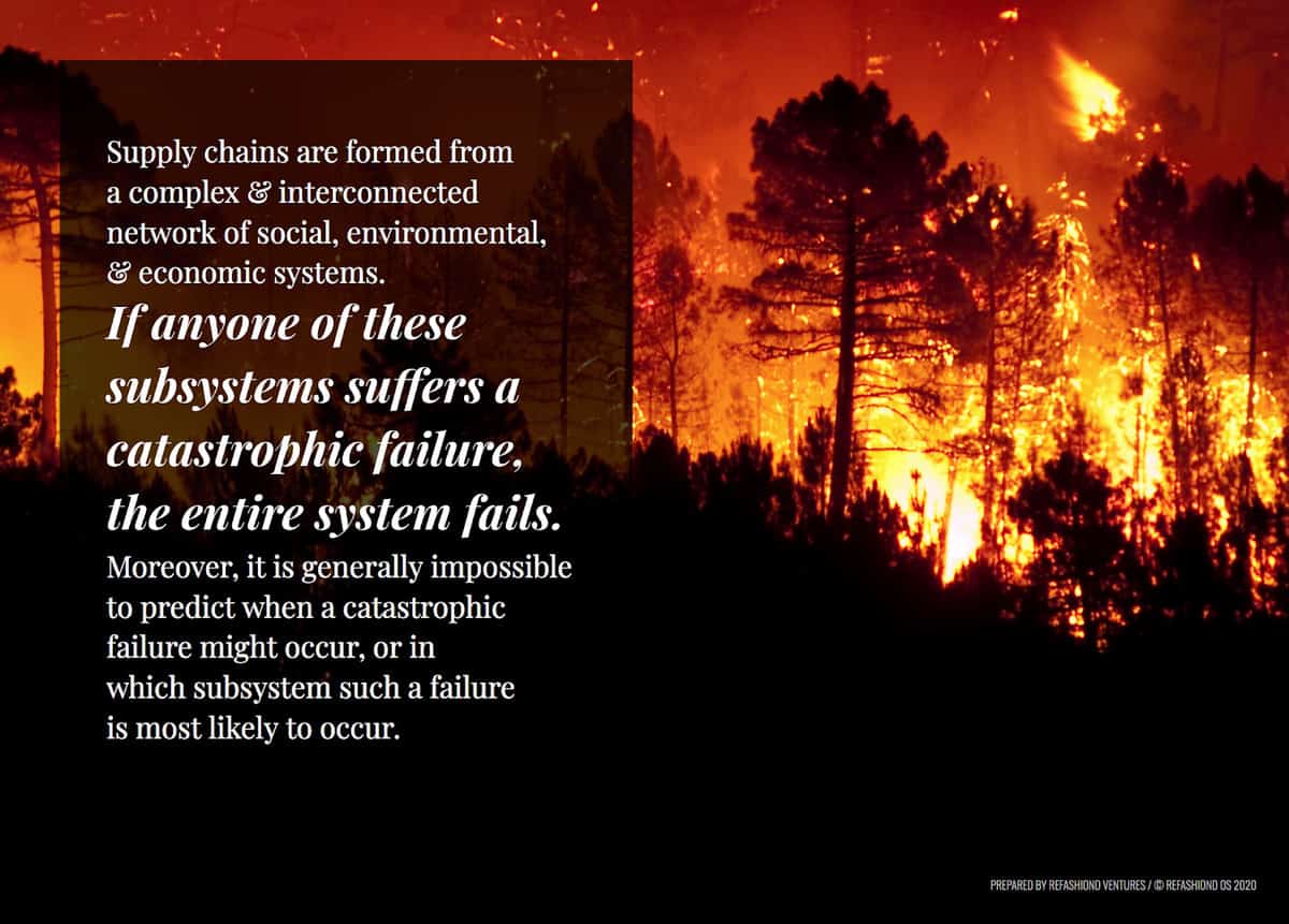 Fourth: Supply chains are formed from a complex and interconnected network of social, environmental and economic systems. If any one of these subsystems suffers a catastrophic failure, the entire system fails. Moreover, it is generally impossible to predict when a catastrophic failure might occur, or in which subsystem such a failure is most likely to occur.