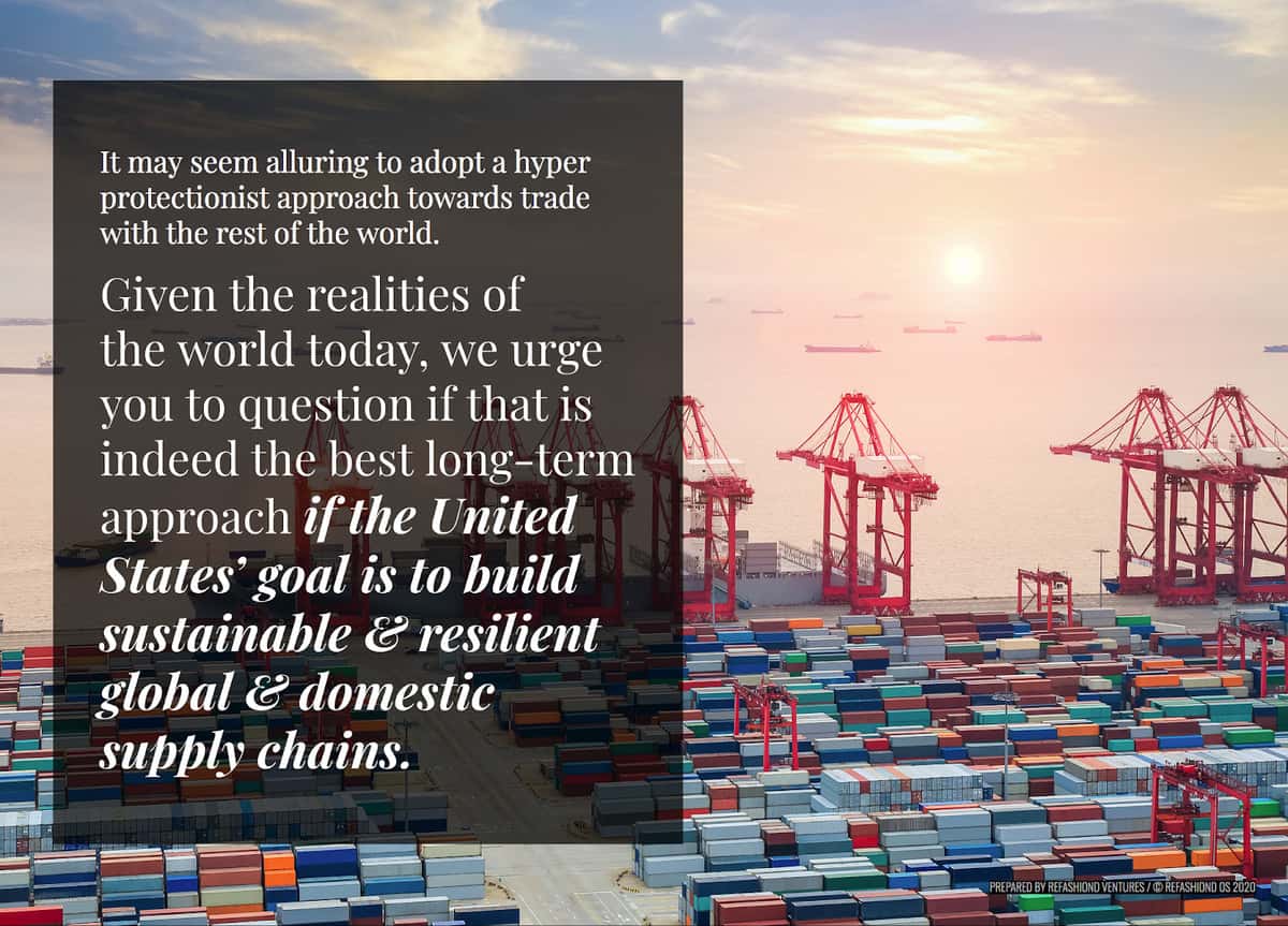 Finally: It may seem alluring to adopt a hyper-protectionist approach towards trade with the rest of the world. Given the realities of the world today, we urge you to question if that is indeed the best long-term approach if the United States’ goal is to build sustainable and resilient global and domestic supply chains?