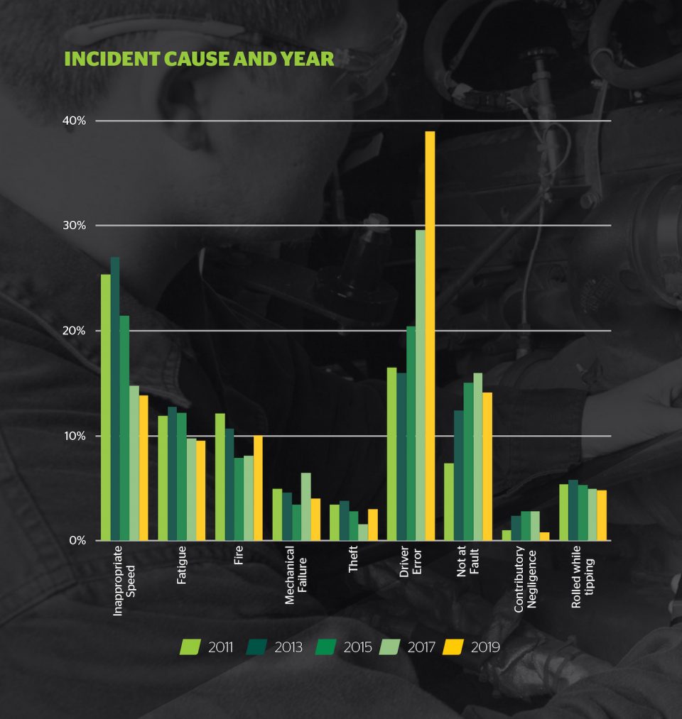 Driver error was deemed to be the cause in 39 per cent of all incidents, it was 29.6 per cent in 2017. Number one error was driver inattention, the second was following too close and the third was inappropriate vehicle positioning, such as cutting corners etc.