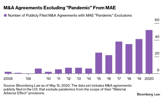 Pandemic MAE exclusions are very likely to be a permanent fixture in M&A agreements even after the crisis passes. Based on Bloomberg Law’s transactional precedent database, which contains all publicly filed M&A contracts in the U.S., 244 M&A agreements have excluded pandemics from the scope of their “Material Adverse Effect” (MAE) provisions since 2006. Noticeable numbers of these pandemic exclusions started appearing in 2015 and reached a high last year, with 41 such exclusions. 2020 has already exceeded all previous years, and we haven’t even hit the halfway mark: There are 52 publicly filed M&A agreements excluding pandemics from the scope of their MAE provisions this year to date.