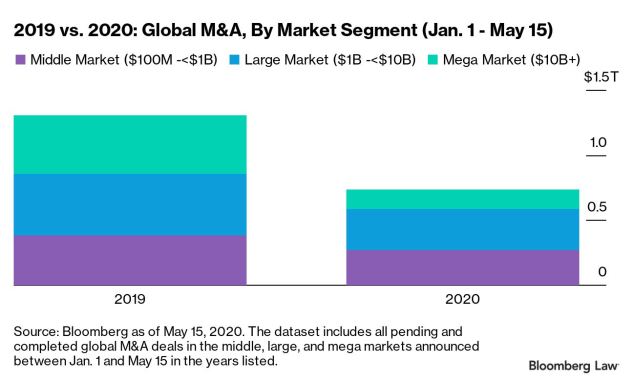 The M&A market has contracted significantly, indicating that the boom of recent years is over. Looking at pending and completed announced global mergers and acquisition deals only, 2020’s year-to-date dollar deal volume for the middle, large, and mega markets combined is 43% lower than in the same period last year. Mega deals—the $10 billion-plus deals that played a pivotal role in boosting sky-high aggregate annual deal volumes in prior years—are largely absent from the headlines. Mega deal volume has dropped by a staggering 67% compared to the same period last year.