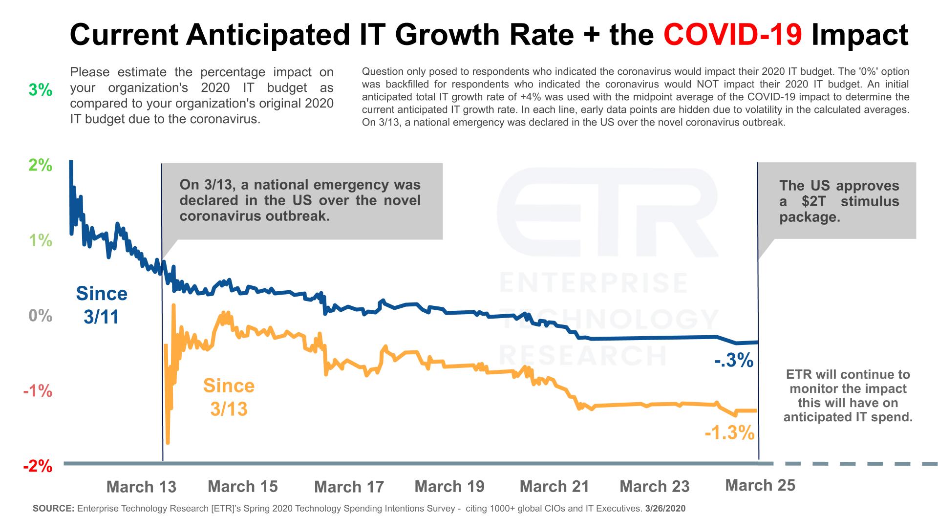If you look at that yellow line again, effectively what you’re seeing is, we remove the first six or seven hundred respondents that took the survey prior to 3/13 when the US declared a national emergency. We can recalculate the growth rate. And we can see it’s around… It’s almost down 1.5%. So the beauty of doing this, really polling daily, is it allows us to be just as dynamic, as many of the organizations we survey. Remember, many CIOs report that these budget changes are going to be temporary. Organizations are figuring out what they’re doing day by day. And a lot of that is dictated based on government actions. And so uniquely here, what we’re able to do is kind of give people a range and also say, “based on these events, this is how things are changing”