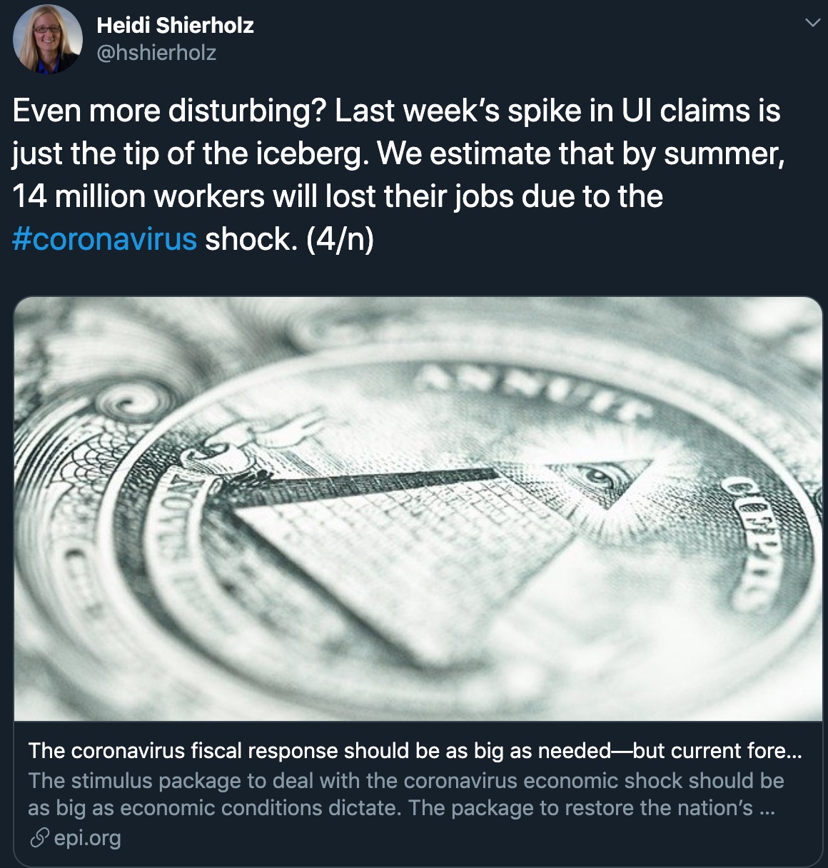 The market is still functioning poorly. Despite the actions in monetary and fiscal policy, oil prices as we mentioned last week, are a big a concern. Jobless claims topping 3 million are believed to be as high as 5 million based on analysis of Google searches by two prominent economists. What’s even more concerning is the shocking forecast that experts estimate we could lose 14 million jobs by this summer.