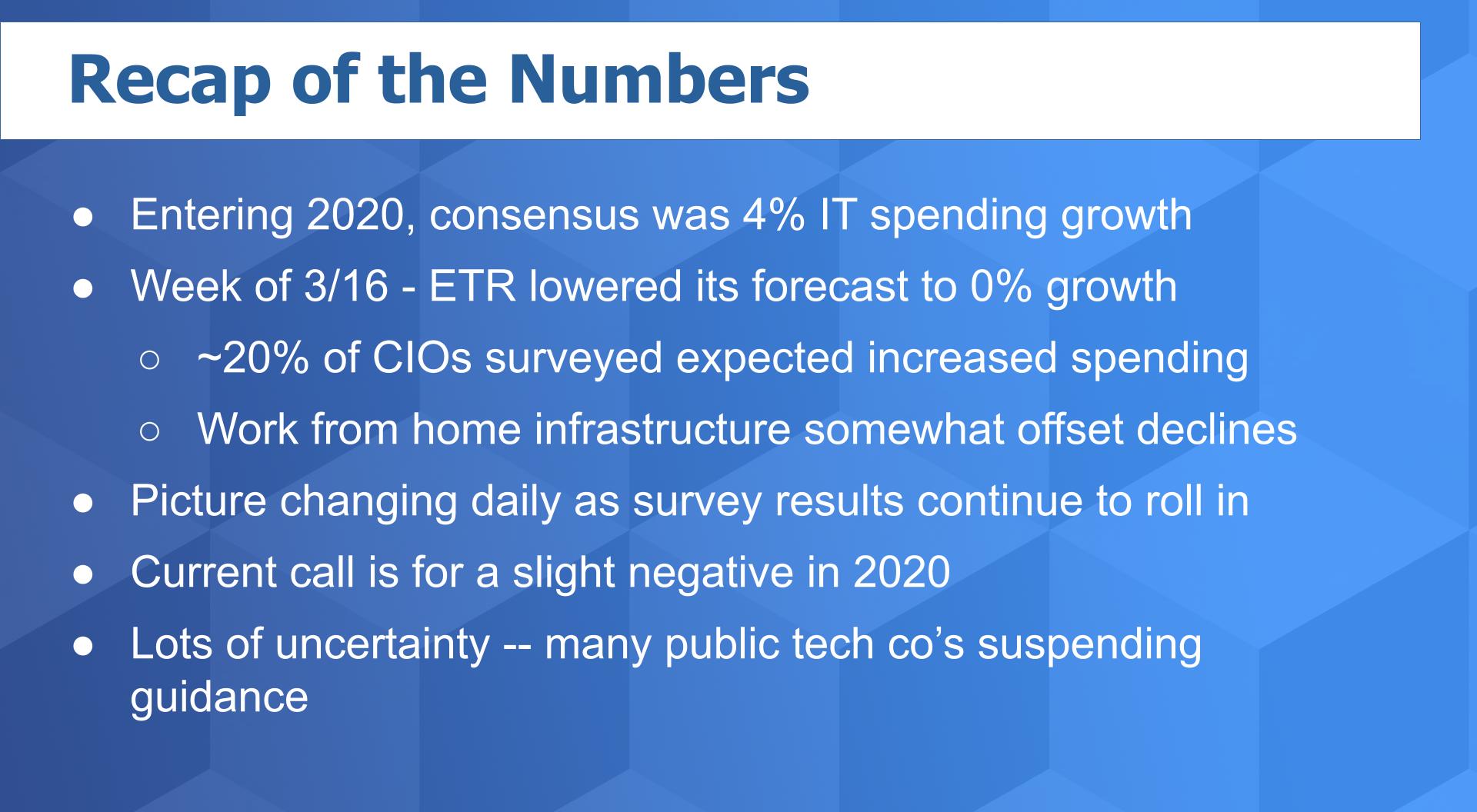 As we reported last week, the ETR surveys have run through the bulk of March. More than 1,000 CIOs and IT buyers had weighed in at that time and the number is now approaching an N of 1,300. We will keep you updated on new survey results as we assess the COVID-19 IT spending impact.