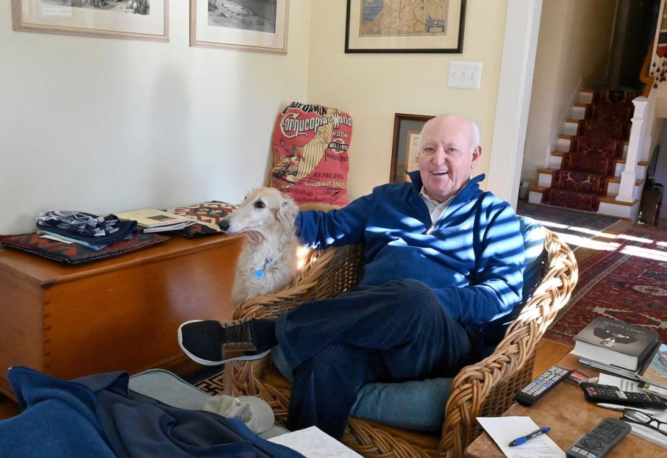 Terry Smith, an Annapolis resident and longtime journalist for the New York Times and other news organizations, has written a memoir, “Four Wars, Five Presidents: A Reporter’s Journey from Jerusalem to Saigon to the White House.” He is photographed in his home, here with one of his borzois, or Russian sighthounds, 4-year-old Anastasia on Monday, December 20, 2021. (Jeffrey F. Bill/Capital Gazette)