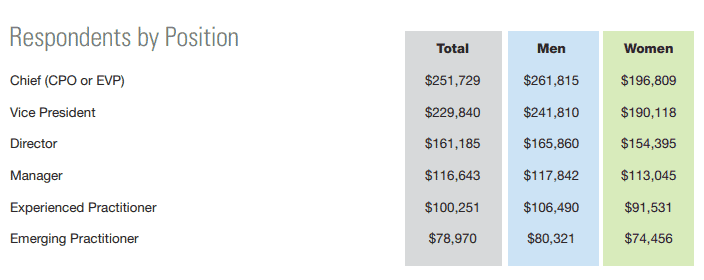 However, continuing a trend found from the start of the annual survey, at all levels men make substantially more than women – about $65,000 less at the CPO level.