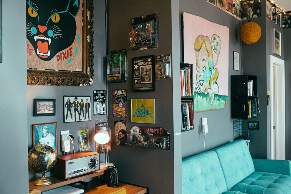 Amenities include a pool table, four flat-screen TVs, a stereo with a turntable and assortment of LPs, video games, a mini-library of books, high-speed internet, Netflix access and more. The unique decor — which relies on vintage furniture, colorful artworks, thrift-shop finds, oddball decorative arts and a blizzard of pop-culture memorabilia — was curated by Saturn’s owner, Brian Teasley.