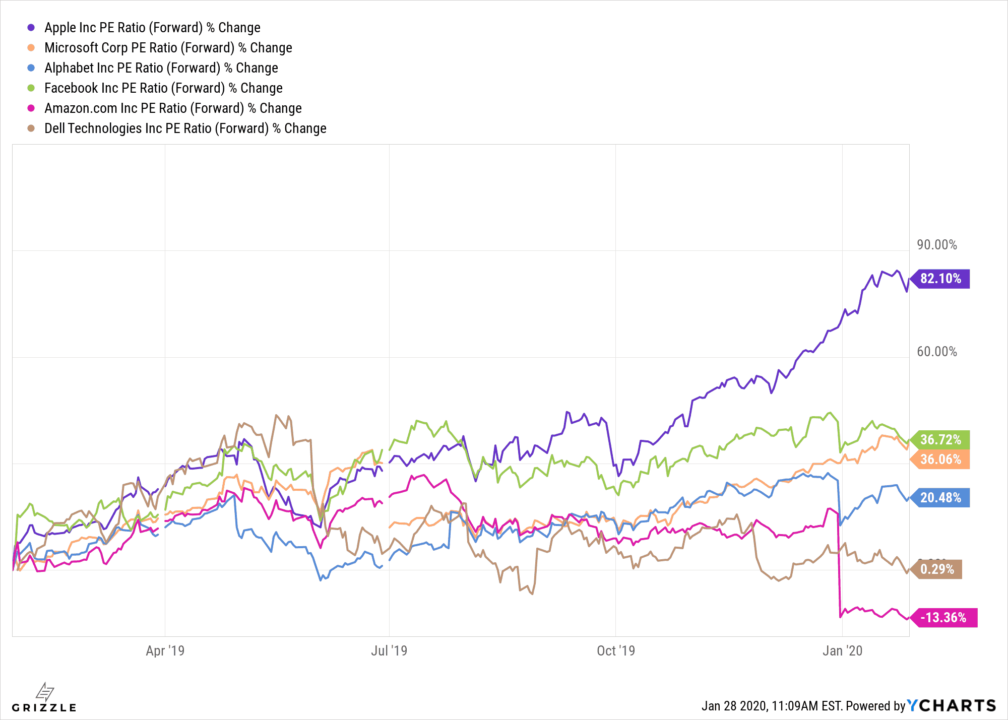 Taking a look at the change in forward P/E of Apple compared to other big names in tech, we see that Apple’s P/E has gone up the most by far throughout the past year, and the stock is trading at a valuation that is much higher than its typical levels. Part of this growth comes from excitement over Apple’s planned adoption of 5G connectivity in upcoming iPhones. Competitors like Samsung already offer 5G options on some of their latest galaxy devices and Apple is expected to follow suit after settling a lawsuit with Qualcomm back in April 2019. Qualcomm is widely expected to be the supplier of the 5G modem chips Apple would need on the upcoming iPhones. Apple’s dominance in the wearable tech industry with the Apple Watch has also certainly helped the stock price grow to new heights. According to 9to5Mac, in August 2019, Apple has the single largest market share of wearable smart devices at 37.9% beating out Fitbit (24.1%) and Samsung (10.6%).