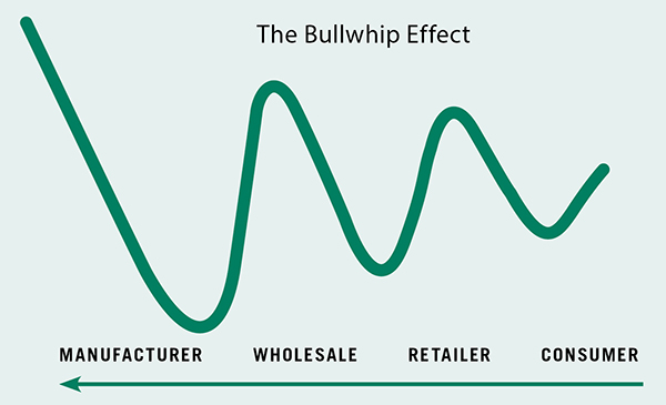 This can cause an unstable supply chain due to what is known as the bullwhip effect (see chart below), where demand variability increases as one moves up the supply chain away from the retail customer, and small changes in consumer demand can result in large variations in orders placed upstream.