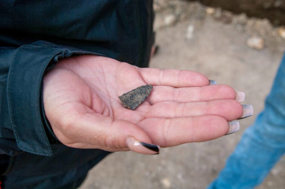 Thursday’s find was a projectile point, possibly from an arrow or a spear, and several pieces of lithic debitage (flakes of shattered stone created as a by-product of stone tool production).