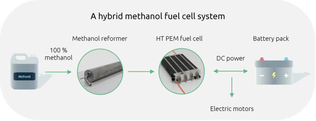Fuel cells is a prominent technology for indirect electrification through renewably produced methanol to overcome the inherent disadvantages of batteries in heavy-duty applications. A methanol fuel cell drivetrain is equipped with an onboard reformer converting the liquid methanol into a hydrogen-rich gas. The fuel cell converts the reformate gas into electricity powering the electric motors. The combination of onboard reforming and high-temperature PEM fuel cells creates a thermal symbiosis offering high electrical efficiency while eliminating NOx, SOx and particle (PM) emissions. Methanol from biomass and renewable origin also eliminates CO2 emissions from a well-to-wheel perspective and truly enables CO2-neutral mobility.