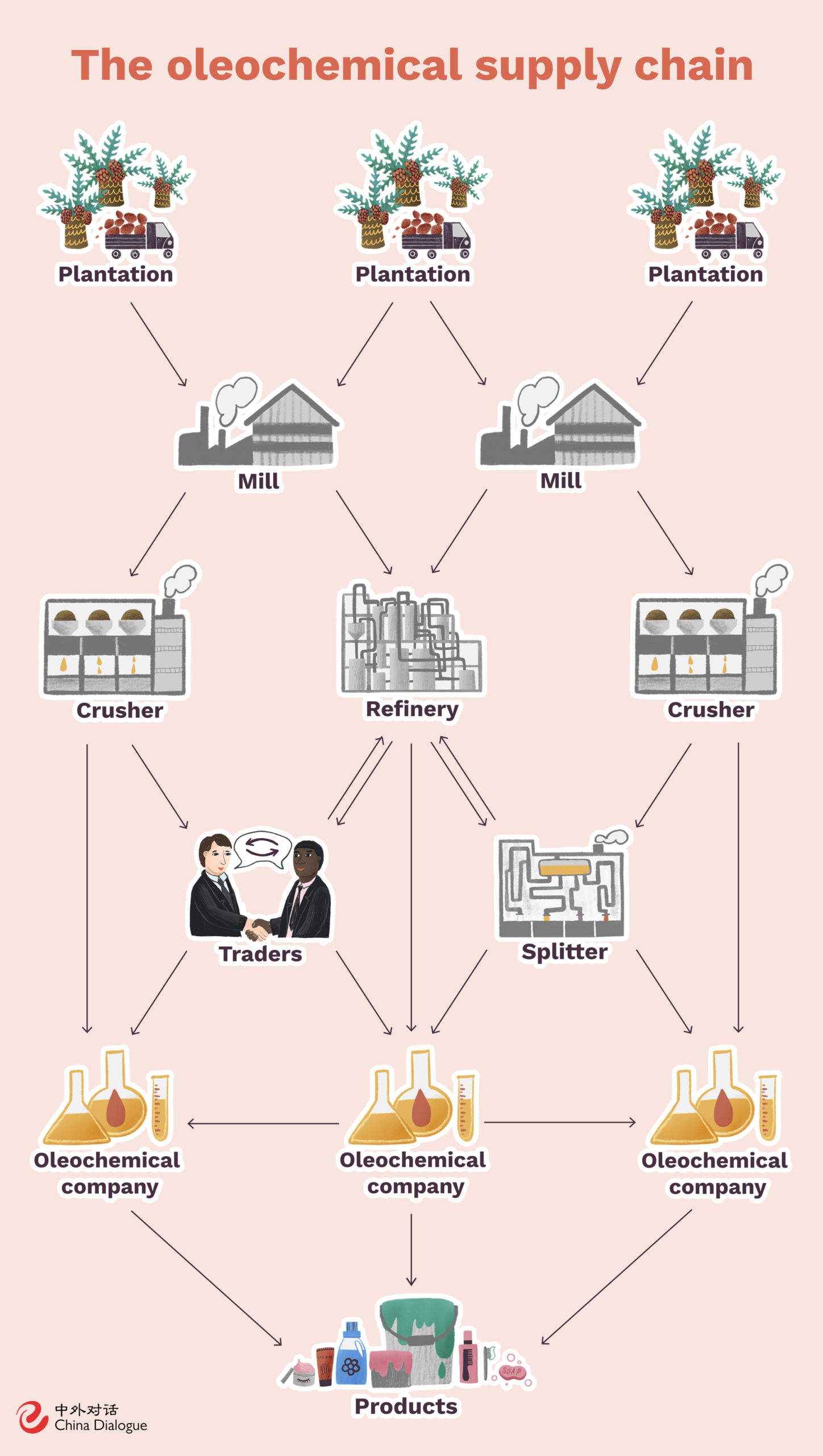 Huge multinationals, like Wilmar International, Cargill and Golden Agri-Resources, have vertically integrated supply chains. This means their operations span the entire chain from oil palm plantations to product manufacturing, including operating refineries and oleochemical plants. They therefore have an advantage in sourcing certified material for oleochemical production and in demonstrating the principles of traceability and transparency.