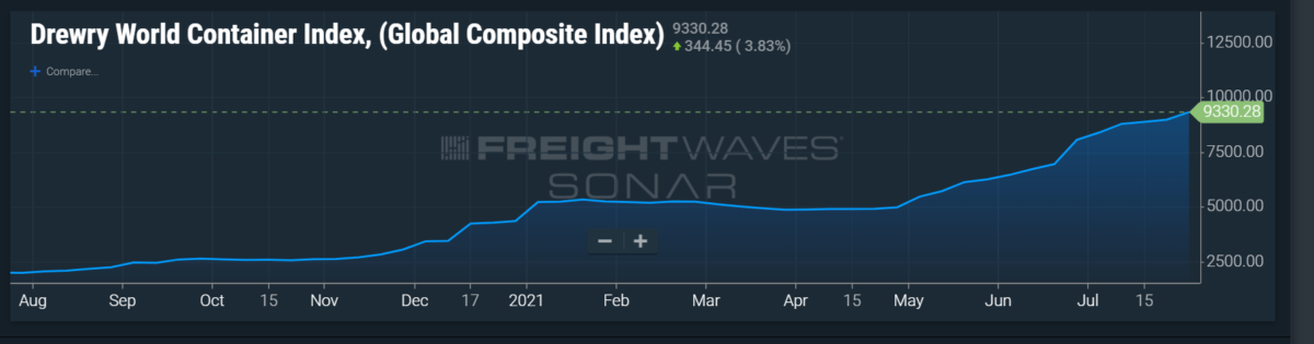 On Thursday, Drewry’s World Container Index increased 4%, or $344, to $9,330 per FEU, a 368% increase from the same week a year ago. Freight rates from Shanghai to New York soared 13%, or $1,562, to reach $13,434 per FEU and increased 6%, to $10,503, for transit to Los Angeles. But those are the averages for short-term transactions before any accessorial charges are tacked on.