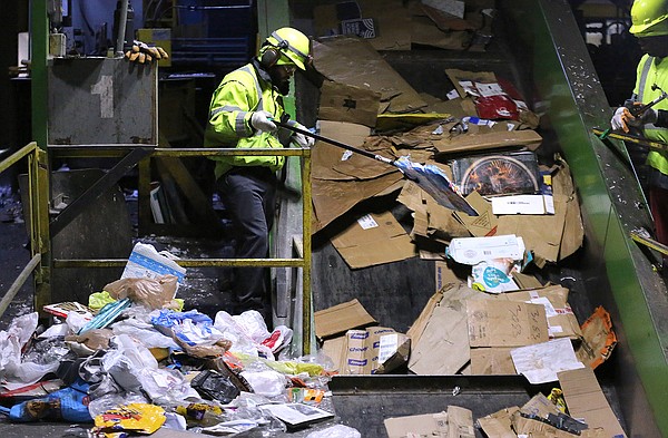 Recyclable materials are pushed onto a conveyor belt to be sorted Wednesday at the Waste Management Little Rock Recycling Facility.