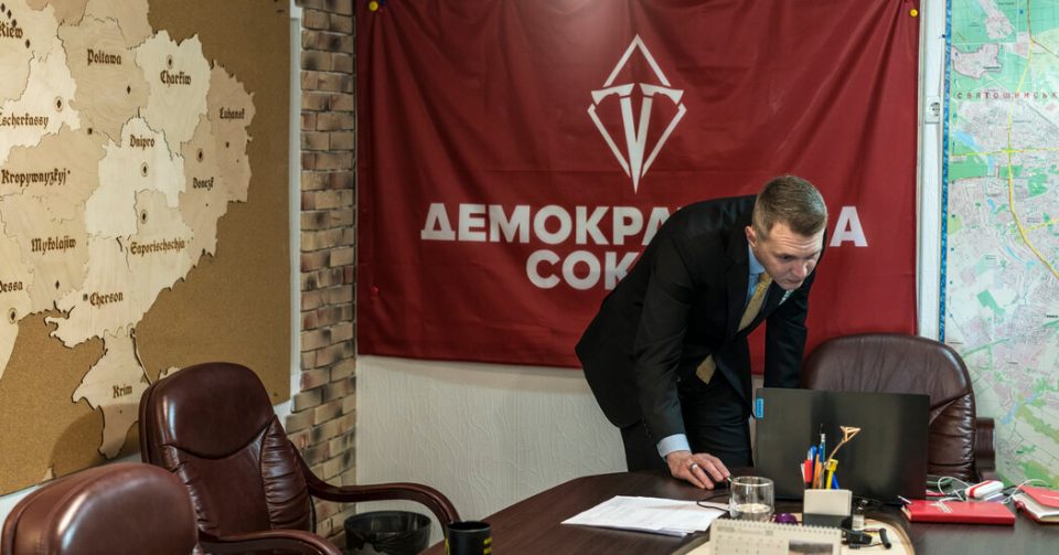 KYIV, Ukraine — The Ukrainian political activist and militia member sat before his party’s flag leaving little doubt about his readiness for action. The flag depicted two axes crossed against a field of red.