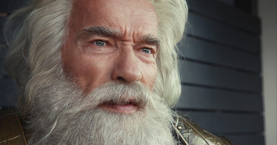 Arnold Schwarzenegger and Salma Hayek playing the Greek gods Zeus and Hera in BMW’s Super Bowl ad.