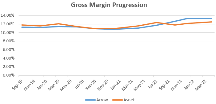 However, in the current supply chain-constrained environment exacerbated by Chinese lockdowns, where conventional lead times have become stretched and even hurt the topline of networking equipment producers like Cisco (CSCO), corporate executives are thinking differently. Thus, both Avnet and Arrow are getting more phone calls for design work, and integrating value-added services like product design into the distribution process has resulted in higher gross margins for both the two companies as shown in the chart below, with Arrow (in blue) leading.