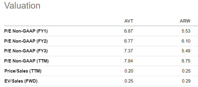 Higher price performance is the reason Avnet bears a higher non-GAAP price to earnings multiple as shown in the table below, but given that its revenue growth for the last reported quarter was 31.96%, or nearly four times Arrow’s 8.21%, it means that it should be valued more in terms of trailing price to sales ratio. Making an adjustment based on Arrow’s P/S of 0.25x and Avnet’s current share price of $45.8, I obtain a target of approximately $57 (45.8 x 0.25/0.20).