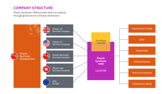Centered on its Lloyd’s Syndicate 1609, Mosaic operates a network of wholly owned capital management agencies, or distribution offices, in Bermuda, London and New York. Additional hubs are expected to be launched next year in Asia, Canada, the Middle East and Europe.