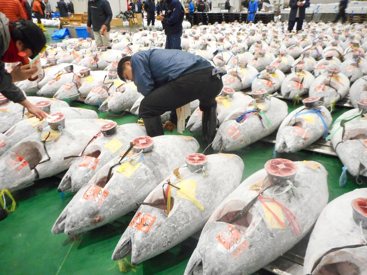 At the first auction of the new year, bluefin tuna caught off Ōma, in the Tsugaru Strait between Honshū and Hokkaidō, can fetch hundreds of millions of yen for a top specimen, but even average fish sell for several million yen each. Given such prices, brokers need to carefully evaluate what they are buying.