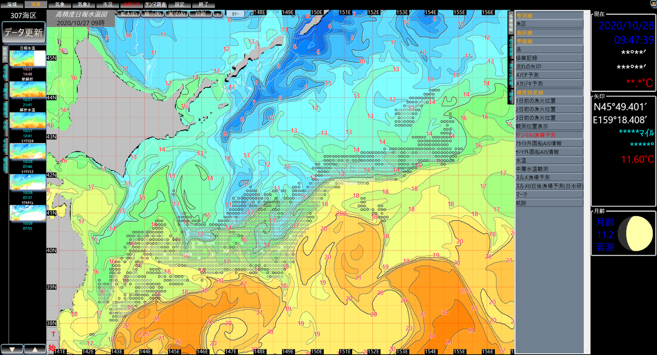 Saury prefer relatively cold waters, and until now, based on knowledge and experience, lead vessels have guided their fleets to promising fishing grounds by examining seawater temperature data. The Ebisu-kun system, which transmits detailed hydrographic and weather data online, is a valuable aid to fishers, and most large vessels use it.