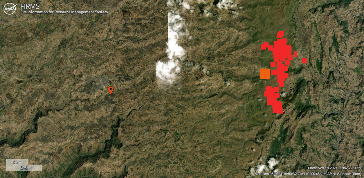 Satellite imagery from NASA’s Fire Information for Resource Management System (FIRMS) shows a cluster of fires burning across Guassa from Nov. 18-22. Image by NASA.
