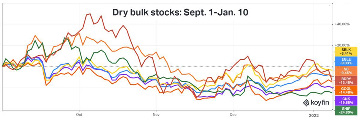 In general, dry bulk stocks fell in October through mid-November and have stayed at lower levels over recent weeks. Since Sept. 1, shares of Seanergy (NASDAQ: SHIP) have fallen 25%, Genco Shipping & Trading (NYSE: GNK) 20%, and Golden Ocean (NASDAQ: GOGL) 15%.