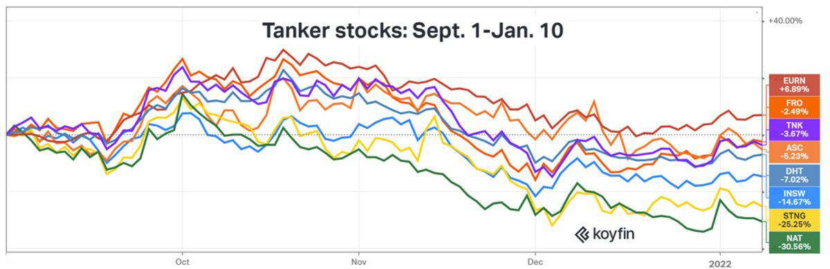 Tanker stocks were buoyed in 2021 by hopes of a recovery that proved premature, and omicron is pushing back the timetable yet again. Most tanker stocks peaked in mid-October and pulled back over recent months.