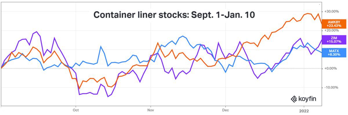 But shares of container liner companies are proving to be the exception. They’ve recouped most of their autumn pullbacks and are gaining more ground this year, trending up and away from the rest of the shipping pack.