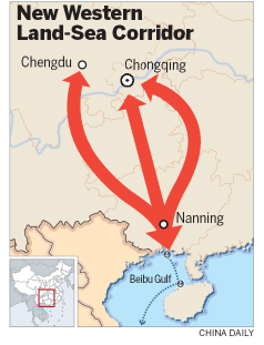 The corridor, called the New Western Land-Sea Corridor, connects major inland cities in southwestern China, such as Chongqing municipality and Chengdu, capital of Sichuan province, with coastal and border cities in southern China’s Guangxi Zhuang autonomous region.