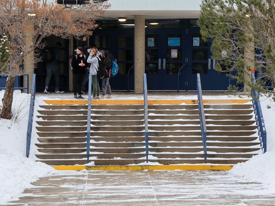 Students at Western Canada High School exit the school for their lunch break on their first day of being back in classes in the new year on Monday, January 10, 2022.
