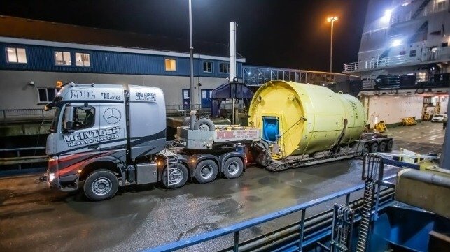 The 16 kW Archimedes Waveswing arrived at Hatston Pier, Kirkwall on Tuesday evening, 25 January 2022, before being transported to Copland’s Dock in Stromness where it will be readied for deployment at EMEC’s Scapa Flow test site in February.