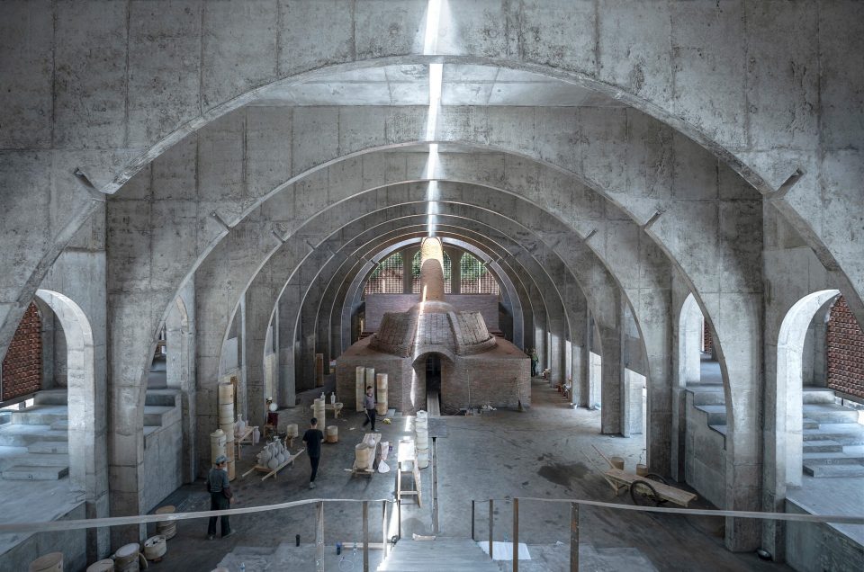 Internally, the entire layout is organised around the kiln as if it were no less than a holy altar. On the ground floor is the entire production line of the workshop: the ‘aisles’ feature tiered spaces dedicated to the complementary activities, such as the glazing or polishing of the porcelain pieces, or have been set up as storage. “The kiln is a ceremonial space where the workers feel a deep sense of pride in their work,” said AZL Architects, whose construction of impressive architectural elements serves specifically to reinforce their sense of belonging to the place.