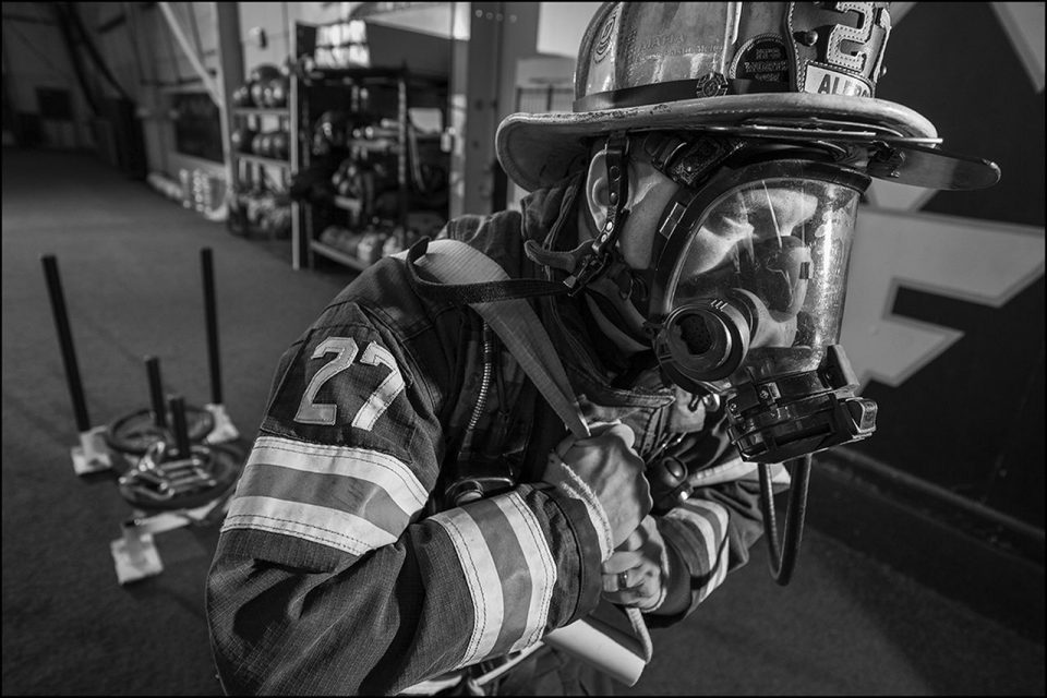 The artist also serves as the chaplain for the department, so his perspective is empathetic and familiar. The photographs are a behind-the-scenes look at the department members’ everyday heroism in the face of danger.