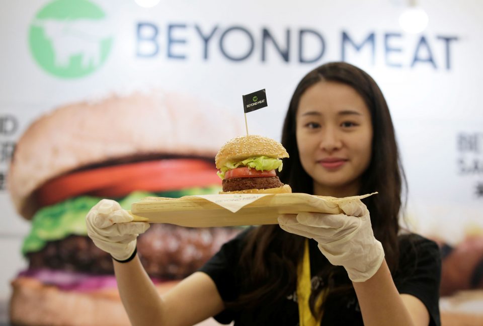 A staff member displays a burger with a Beyond Meat plant-based patty at VeggieWorld fair in Beijing, China November 8, 2019.