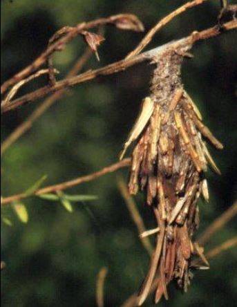 In May and June (depending on location and temperature) the eggs hatch and the larvae (worm) spin down on silken threads. These small worms are blown about by the early spring breezes. Often the worms can be dangling from the trees on a silk thread just waiting for a spring breeze to carry them to a new location. Most of the larvae land on the original host plant but some small worms may be moved for some distance on the silk thread. When the larvae lands at a new location they will begin forming a new bag. As the bagworms grow, it enlarges the bag and adds fresh plant material to the outside. The bag is firmly attached by a sturdy silk band which the bagworms usually wrap around a twig.