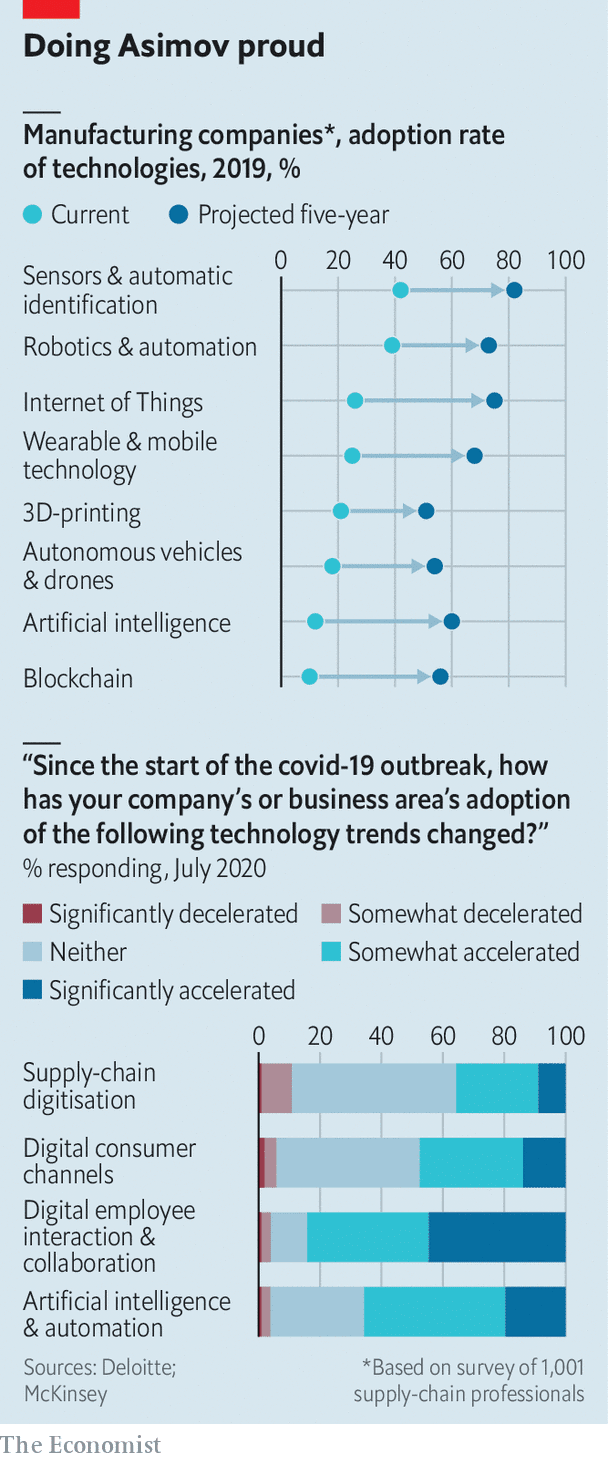 Right now cobots help with social distancing. But, says Dwight Klappich of Gartner, a research firm, robots that move goods to workers will be a boon for post-pandemic productivity, too (as well as for the morale of humans, by sparing their weary feet). Luke Jensen of Britain’s Ocado, an online grocer and robotics pioneer, insists that his low-margin industry must find ways of fulfilling the recent surge in online orders with less labour. His firm already serves the bulk of its British customers from just three highly automated sites. Kroger, a big American grocer, is now expanding its roll-out of Ocado equipment both in warehouses and at its retail outlets.